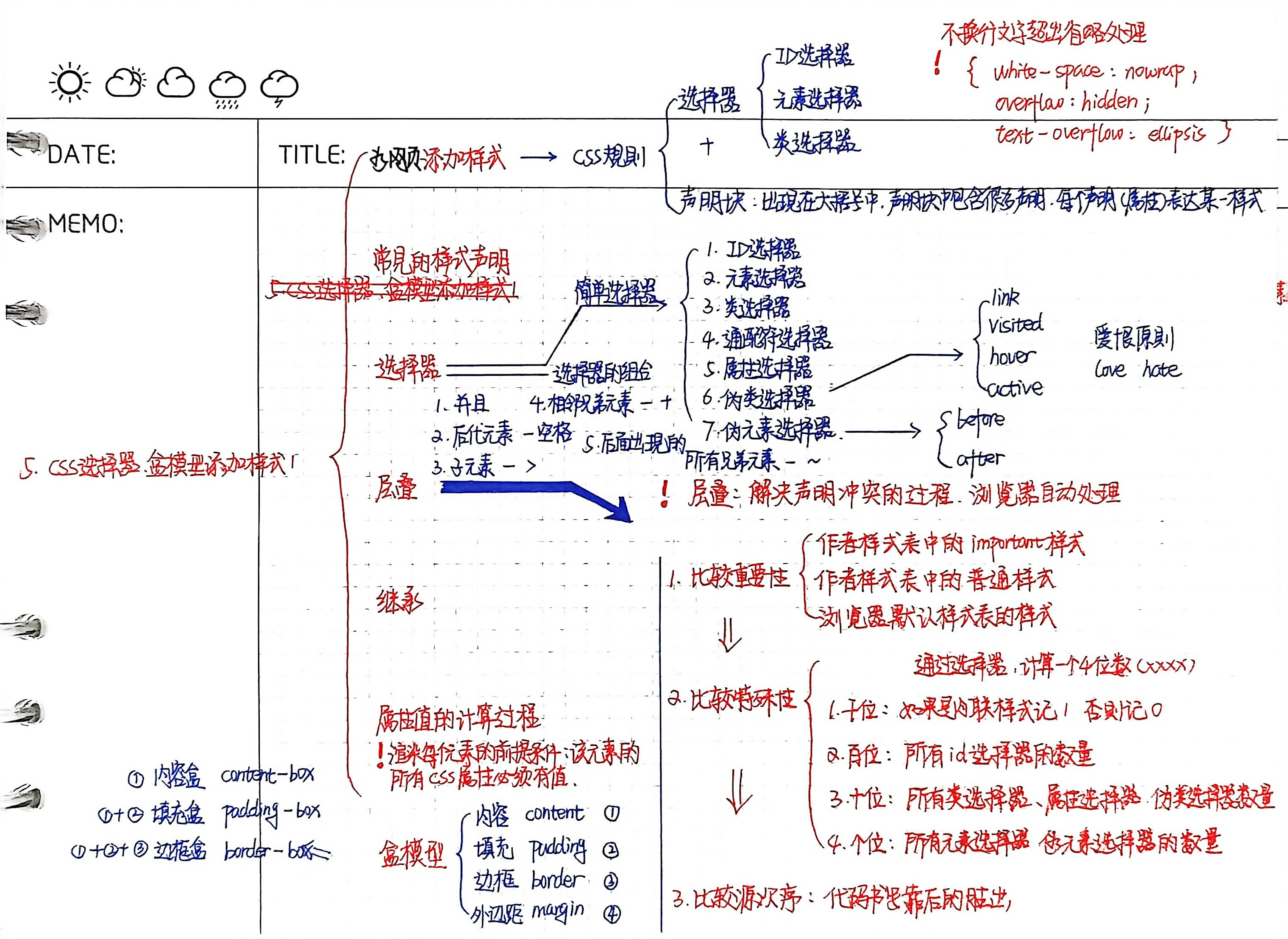 !important> 特殊性 > 代码顺序; - 继承:子元素继承父元素文本样式,减少重复代码;